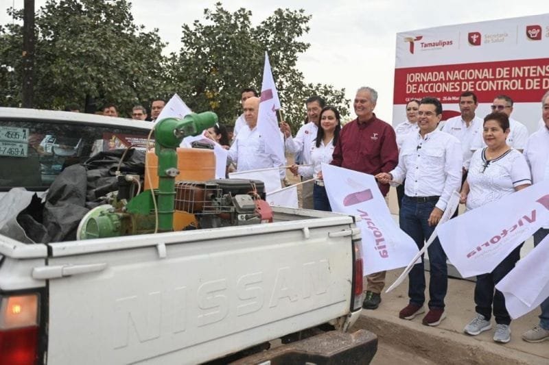 Cd. Victoria, 25 de mayo. – Con el llamado a la ciudadanía a sumarse a las acciones para la prevención del dengue 2025, el presidente municipal de Victoria Eduardo Gattás Báez y el secretario de Salud Estatal Vicente Hernández Navarro, dieron el banderazo a las brigadas de descacharre y eliminación de criaderos del mosco transmisor del virus.