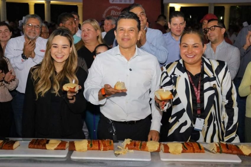Con la participación de 300 familias y el talento gastronómico de jóvenes alumnos de la Universidad Vizcaya Victoria, el alcalde de Victoria Lalo Gattás y su esposa Lucy de Gattás, presidenta del DIF Municipal, degustaron la Monumental Rosca de Reyes.