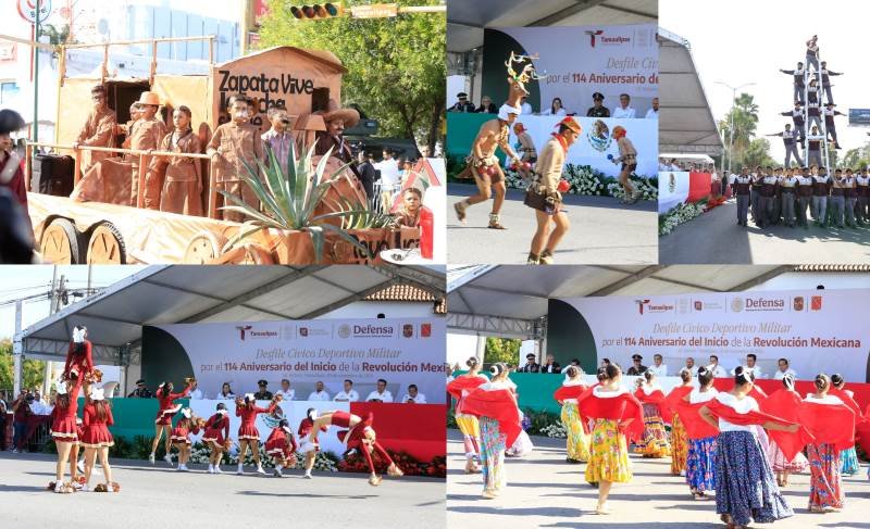 Acompañado por el general DEM Enrique García Jaramillo, comandante de la 48ª Zona Militar, el gobernador Américo Villarreal atestiguó, por espacio de casi cuatro horas, el paso de los contingentes llenos de colorido, música tradicional mexicana y atuendos revolucionarios, todos ejecutando sus rutinas, tablas gimnásticas, pirámides monumentales y evoluciones ante el aplauso de los miles de familias congregadas a lo largo del bulevar Tamaulipas, de esta capital.
