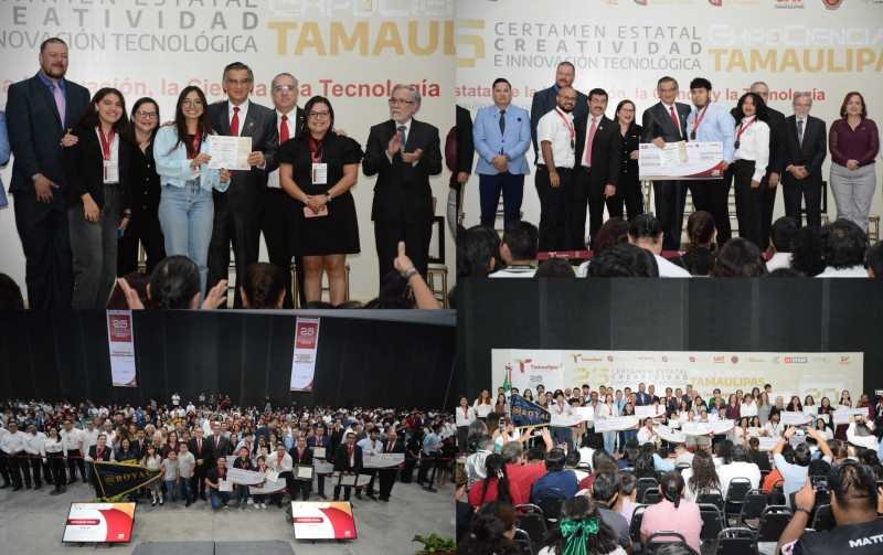 Al presidir la ceremonia de premiación del 26 Certamen Estatal de Creatividad e Innovación Tecnológica-ExpoCiencias Tamaulipas y la entrega del Premio Estatal de la Innovación, la Ciencia y la Tecnología en el Polyforum de esta capital, el gobernador del Estado, junto con la secretaria de Educación, Lucía Aimé Castillo Pastor y el director general del Consejo Tamaulipeco de Ciencia y Tecnología, Julio Martínez Burnes, felicitó a las y los ganadores y aseguró que con su talento, conocimiento, investigación y desarrollo, con una visión colaborativa y participativa, podrán brindar soluciones para este futuro de oportunidad y de riesgo del que tenemos que salir adelante.