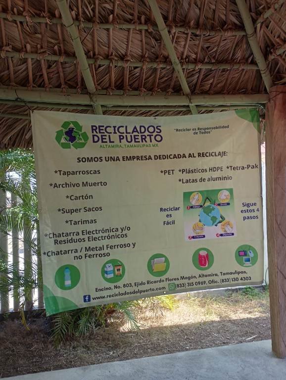 Reciclados del Puerto es una empresa que se dedica al reciclaje y por ende al mejoramiento del medio ambiente, aparte que recolectan, plástico , cartón, tapa roscas botes, tarimas, chatarra electrónica y/o residuos electrónicos con las pilas que se utilizan en la aparatos electrónicos que contienen un ácido que contamina si los llegaron a tirar en el mar o en el río, chatarra de metal ferroso y no ferroso, plásticos, tetra Pak la orientación que les dan a la ama de casa es la leche los jugos que vienen en depósitos tetra Pak sean enjuagados únicamente Con agua para que puedan ser rutilizados, está Empresa se encuentra ubicada en Encino No. 803 colo. Ricardo Flores Magon en Altamira Tamaulipas teléfono 833-315-09-69 Oficina y el833-130-43-03