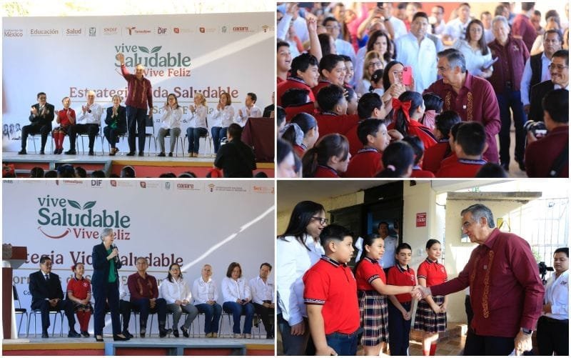 Ciudad Victoria, Tamaulipas.- El gobernador Américo Villarreal Anaya y la presidenta del DIF Tamaulipas, doctora María de Villarreal pusieron en marcha las Jornadas de Salud Escolar “Vive Saludable, Vive Feliz”, una iniciativa de la presidenta Claudia Sheinbaum, mediante la cual 20 brigadas recorrerán el estado para atender a más de 315 mil alumnas y alumnos de 2,094 escuelas primarias a fin de realizar mediciones de peso y talla, revisión visual y de salud bucal, así como fomento de hábitos saludables, creando un expediente digital para cada estudiante.